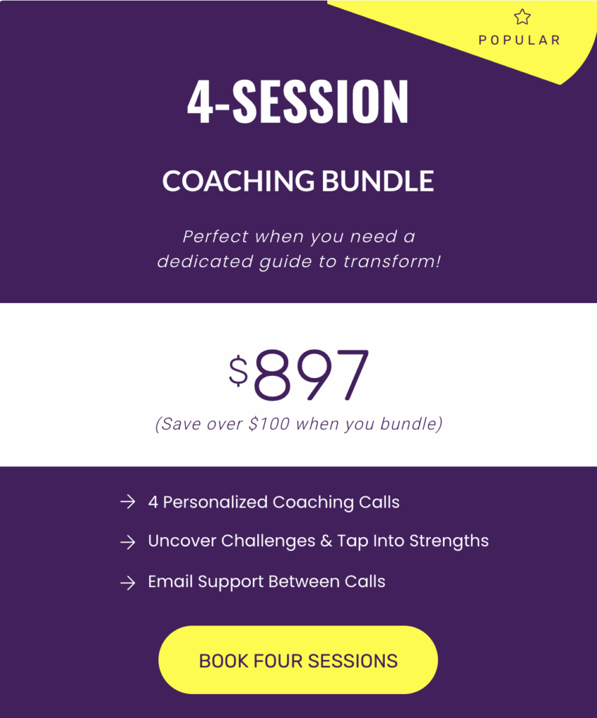To make the changes you want in your life, we’ll visit your true beliefs, values, and goals, and identify what’s getting in the way. Most people know what to do, but get stuck in a negative pattern, don’t believe they can change, or never commit. As your coach, I provide a safe space to explore, help you map a path to succeed, and challenge you with actionable steps to move forward and thrive!